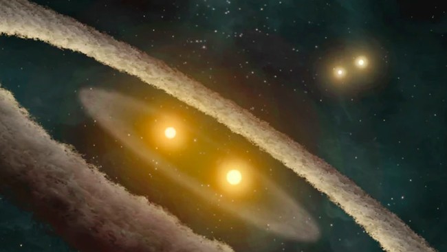 Para astronom untuk pertama kalinya menemukan sistem unik yang memiliki dua bintang biner yang mengorbit satu sama lain dan bintang yang lebih besar mengorbit keduanya. Dunia ini mereka namakan HD 98800 yang terletak 150 tahun cahaya di konstelasi TW Hydrae.