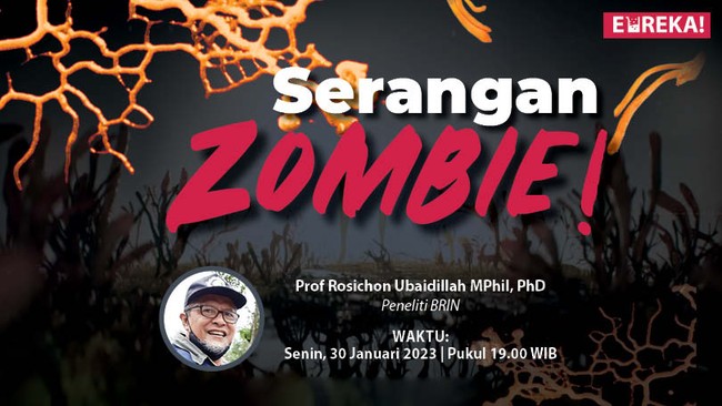 "Jamur Ophiocordyceps unilateralis memerlukan inang semut untuk menyelesaikan siklus hidupnya dan menyebarkan spora untuk menyerang semut lain dengan cepat dalam 3-9 hari agar semut yang terinfeksi menjadi zombie," kata kata Rosichon saat live Eureka! Serangan Zombie, Senin (30/1/2023) malam.