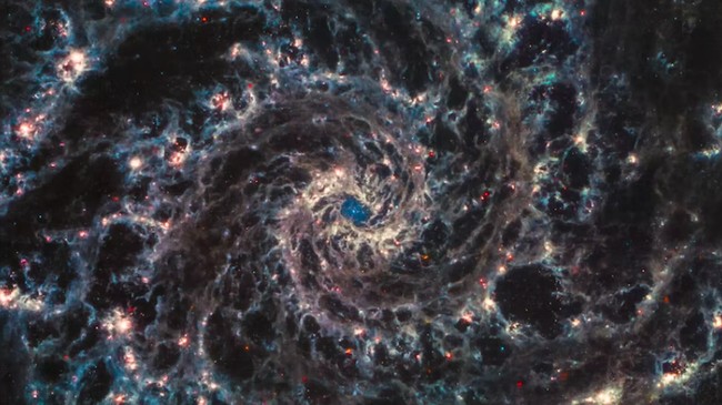 Para astronom juga mengamati galaksi spiral NGC 628 yang dikenal sebagai Messier 74 atau Galaksi Hantu. Untuk melihatnya, JWST mengintip 32 juta tahun cahaya ke konstelasi Pisces.