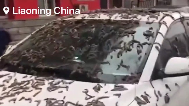 Dalam sebuah video cuplikan yang viral dari akun Twitter Rawsalerts, memperlihatkan mobil-mobil yang dihujani benda seperti cacing-cacing berceceran di sekitar mobil. Video tersebut memperlihatkan penduduk setempat melindungi dirinya dengan payung untuk menjalankan aktivitas sehari-hari.