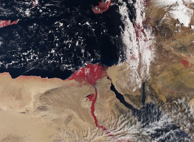 Dalam gambar yang dirilis European Space Agency (ESA) pada April 2016, tampak jalur air yang menuju ke Mesir berubah warna menjadi merah seperti darah. Gambar ini diambil oleh satelit Sentinel-3A, bagian dari program misi Copernicus yang diluncurkan 16 Februari 2016.
