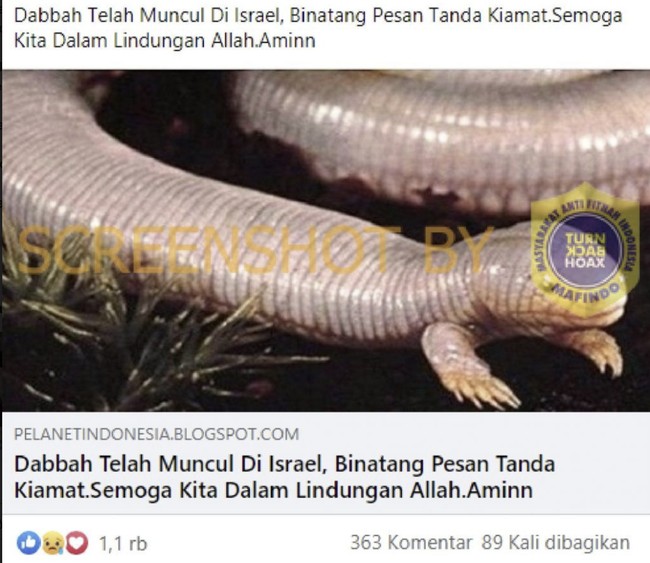 Sempat viral beberapa waktu silam, narasi munculnya hewan tanda kiamat di Israel bernama Dabbah. Kabar tersbeut sempat menghebohkan warga di internet, terutama Facebook.