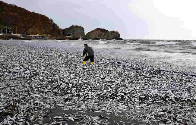 Ribuan ikan sarden dan makarel terdampar di pantai dekat pelabuhan perikanan Toi di Hakodate, Hokkaido, Jepang pada Kamis (7/12) pagi. Banyak yang mengaitkan peristiwa ini dengan limbah air dari pembangkit listrik tenaga nuklir Fukushima yang dialirkan ke laut.