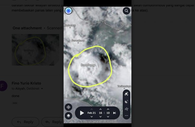 Terlihat, satelit itu menangkap gambar pada 21 Februari pukul 16.10 WIB. Di langit Bandung, terpampang pusaran yang tampak luas.