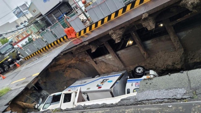 Hujan deras yang melanda Busan, Korea Selatan, menyebabkan kembali munculnya sinkhole alias tanah yang amblas membentuk sebuah lubang besar. Akibatnya, dua truk yang sedang berjalan tiba-tiba 'ditelan' sinkhol tersebut.