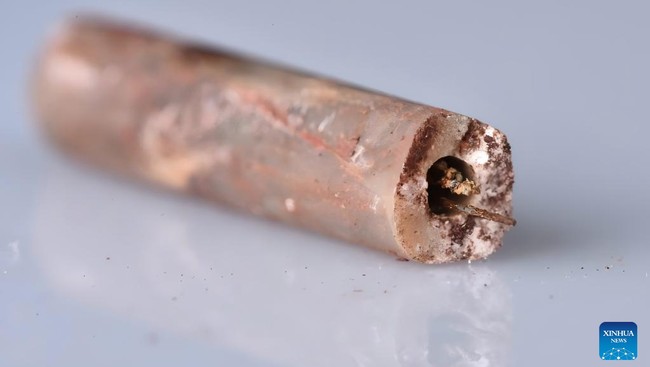 "Setidaknya lima pecahan jarum terlihat di dalam bagian tabung giok yang rusak. Hanya satu yang dapat diekstraksi sepenuhnya; yang lain tetap tertanam di dalam, dengan jejak tekstil yang sudah membusuk dan menempel di jarum," kata kepala tim penggalian makam, Yang Jun.