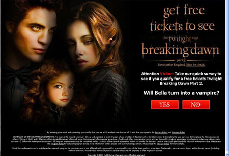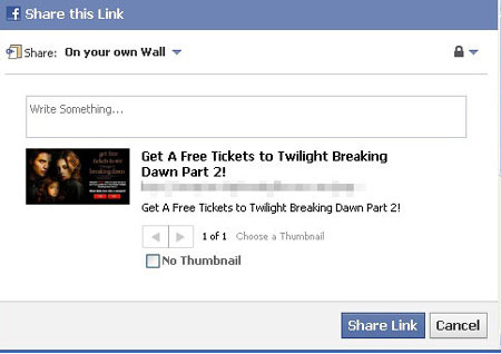Dengan mengusung judul 'Get A Free Tickets to Twilight Breaking Dawn Part 2!', pengguna Facebook disarankan agar tidak mengklik dan percaya begitu saja dengan tawaran tiket gratis premier Twilight Saga.