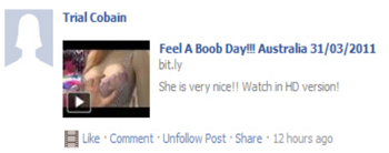 Hal yang menarik dari penyebaran message 'Feel A Boob Day!!!' ini adalah hanya melakukan postingan di group-group Facebook dan tidak melakukan postingan pada wall korbannya maupun kontak Facebook lain.
