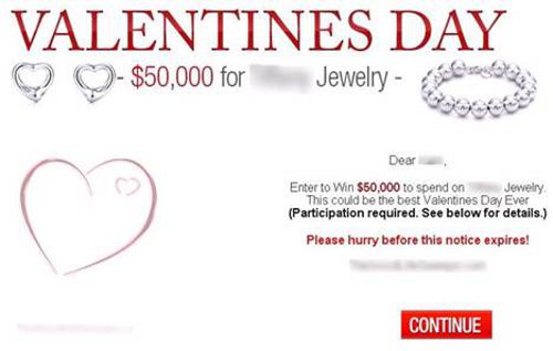 Spam jejaring sosial juga berada tidak jauh di belakang teknik pencurian informasi lainnya dalam hal mengambil data pribadi pengguna. Ada banyak aplikasi palsu yang menargetkan hari Valentine yang mengarahkan pengguna ke sebuah situs survei. Di bawah ini merupakan contoh salah satu aplikasi palsu tersebut.