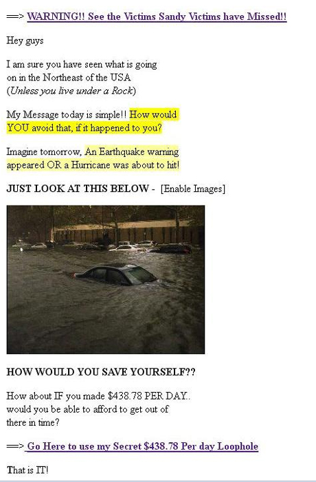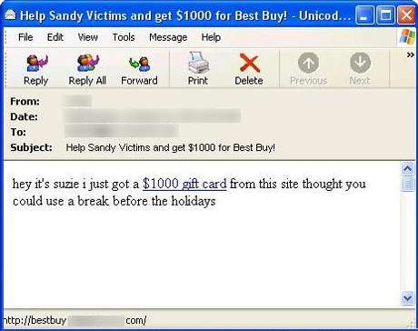Ada beberapa subyek email yang digunakan pelaku. Mulai dari 'Help Sandy Victims and get $1000 for Best Buy!' dan 'Sandy Strikes... [WARNING]'.
