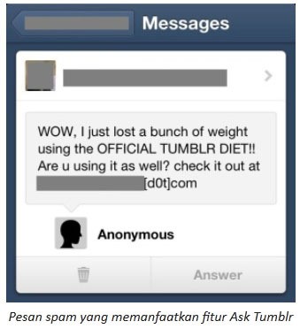Awas! Scammer Incar Pengguna Tumblr - detikInet Kamis, 30 Mei 2013 07:21 WIB Tautan telah disalin Scam Tumblr Diet (symantec) Jakarta - (ash/ash) Tautan telah disalin