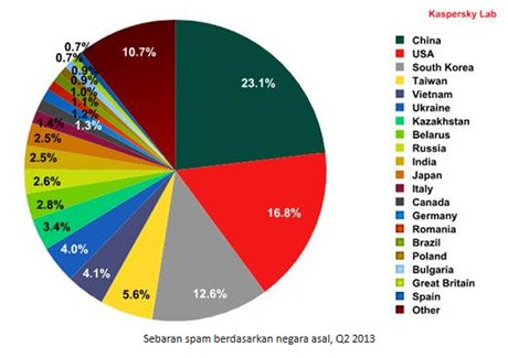 Dari catatan Kaspersky Lab, mayoritas email spam tetap berukuran kecil dengan file di bawah 1 Kb. Pada kuartal kedua, email spam berukuran kecil naik 4,8% dan secara total menyumbang 73,8% dari seluruh email spam.
