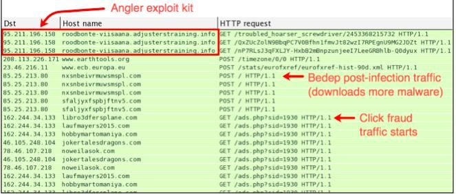 Gambar 2: Angler Exploit Kit yang juga menginstalkan ClickFraud Bedep (kredit: https://blog.rackspace.com)