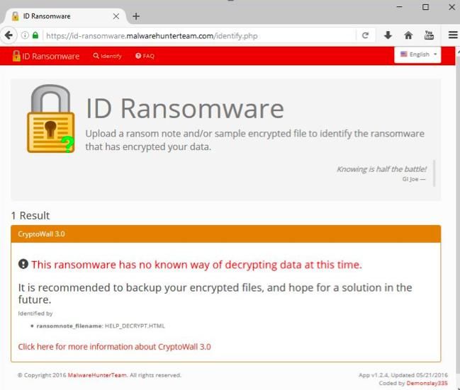 Gambar 3: Contoh identifikasi Ransomnote yang terdeteksi sebagai Cryptowall 3.0 dan belum dapat didekripsi |