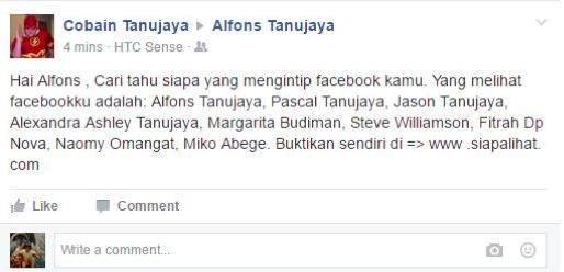 Pada postingan di wall Facebook tersebut tidak lupa disertakan nama-nama sebenarnya langsung dicomot dari friend list akun korban yang diklaim mengintip akun Facebook yang telah dikuasai spambot tersebut supaya calon korban lainnya percaya dan mengikuti apa yang diperintahkan oleh situs siapalihat. Sekali korbannya mengklik tautan yang diberikan, maka proses rekayasa sosial dimulai (lihat gambar 5).
