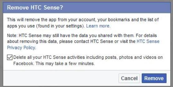Pastikan Anda memilih centang "Delete all your HTC Sense activities including posts, photos and videos on Facebook. This may take few minutes" dan klik [Remove] untuk menghapus aplikasi HTC Sense dan membebaskan Anda dari eksploitasi bot ini