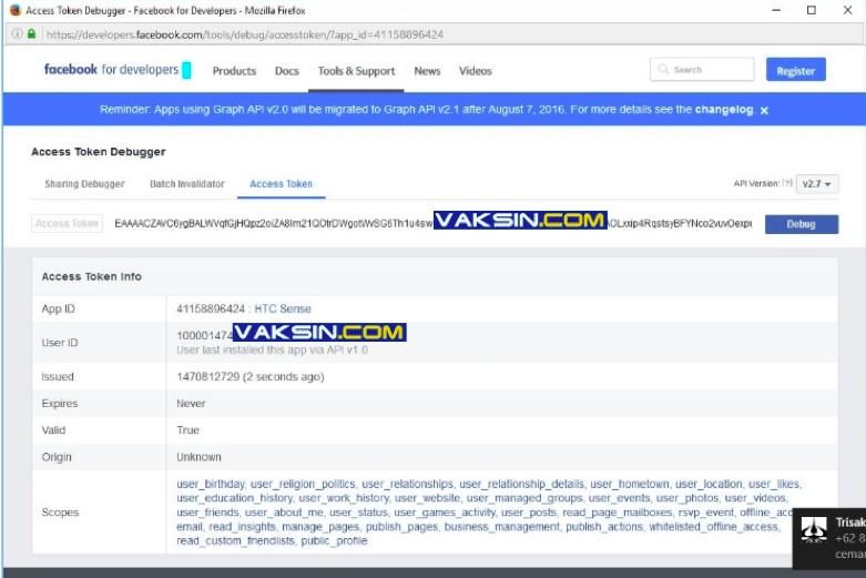 Jika Anda mengklik tombol oranye seperti gambar 8 di atas maka Anda akan mendapatkan pop up 'Access Token Debugger' dari situs developers.facebook.com seperti pada gambar 10 di bawah ini.