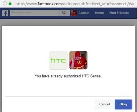 Instruksi ini pada dasarnya terdiri dari tiga point. Pertama, jika Anda ikuti dan mengklik tombol berwarna hijau akan melakukan instalasi HTC Sense dengan tampilan seperti pada gambar 1-3 di atas. Jika akun Facebook Anda sudah memiliki aplikasi tersebut yang akan muncul adalah konfirmasi seperti pada gambar 9 di bawah ini.
