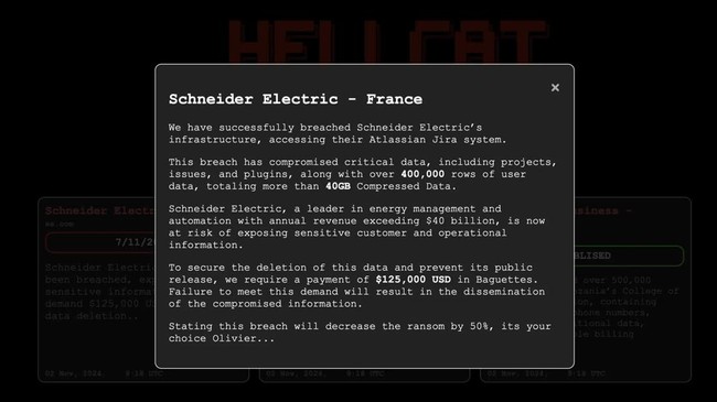 Dalam pesannya ke Schneider Electric, Hellcat mengklaim berhasil mencuri data terkompresi sebesar 40GB, dan mengancam akan membocorkan data tersebut ke publik jika Schneider tak memenuhi tuntutan Hellcat.