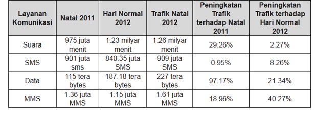Berikut adalah performansi trafik layanan komunikasi Telkomsel saat Natal 2012 dibandingkan dengan trafik hari normal 2012, dan trafik Natal 2011: