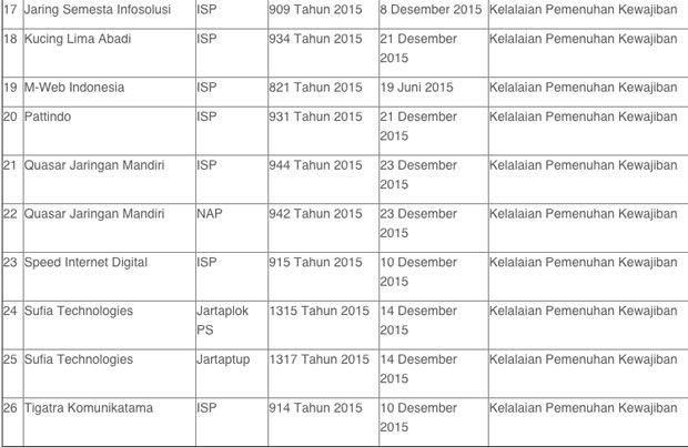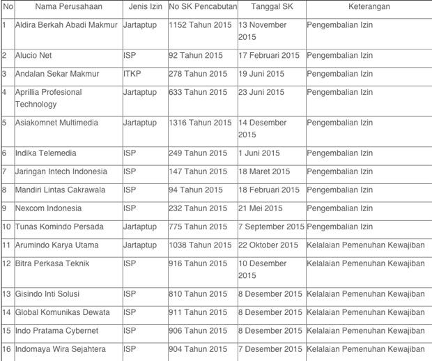 Berikut daftar perusahaan yang dicabut izin penyelenggaraan telekomunikasinya pada tahun 2015: