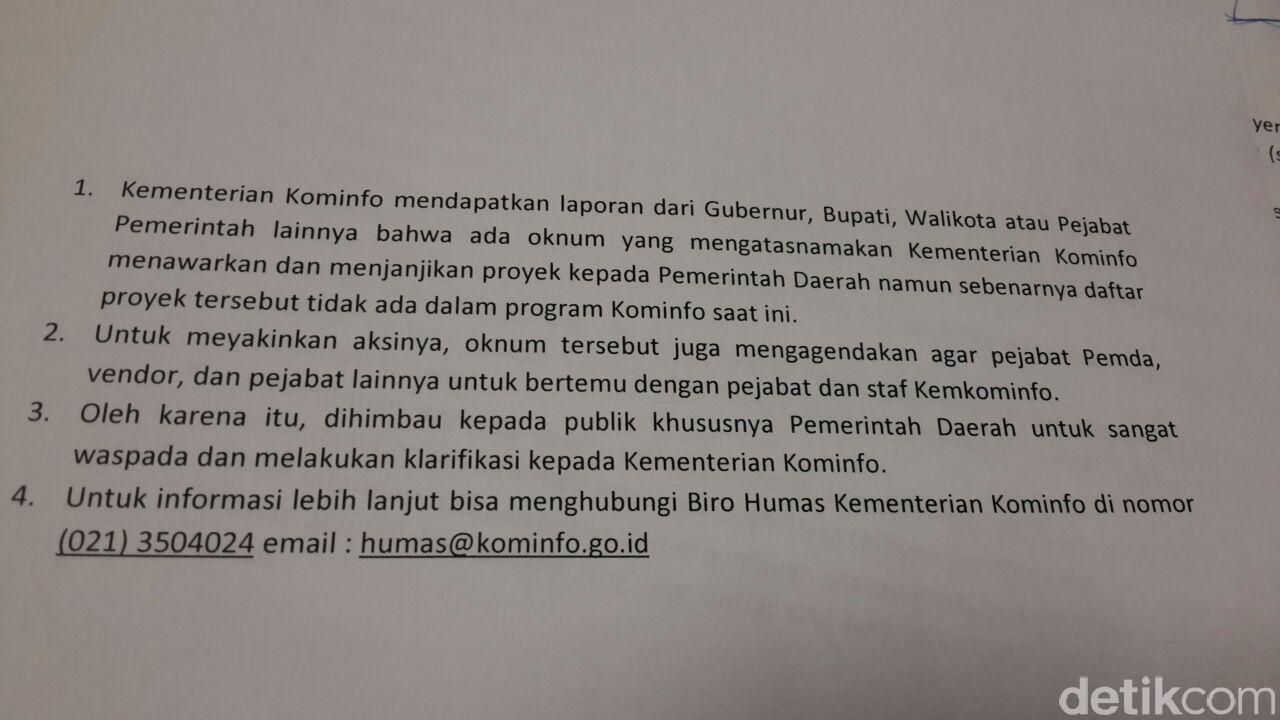 Dalam list program palsu alias proyek bodong itu, Kominfo diklaim oleh sang broker, memiliki proyek-proyek yang akan dikerjasamakan dengan menggandeng Pemda.