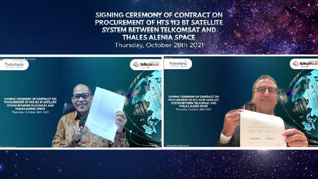 Penandatanganan kerja sama dilakukan secara online oleh Direktur Utama Telkomsat, Endi Fitri Herlianto dan President & CEO Thales Alenia Space, Hervé Derrey dari lokasi masing-masing. Kegiatan ini turut dihadiri oleh jajaran komisaris dan senior leaders Telkomsat serta beberapa perwakilan dari Thales Alenia Space yang menyaksikan.