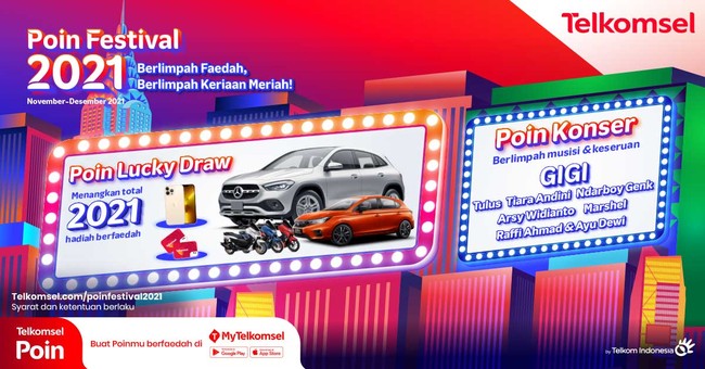 Menjelang akhir tahun, Telkomsel kembali menggelar Poin Festival 2021. Berlangsung hingga 31 Desember 2021, Poin Festival 2021 menjadi program loyalty bagi pelanggan yang telah setia menggunakan produk dan layanan Telkomsel.