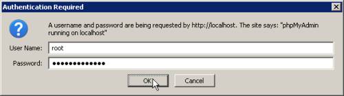 1. Ketik https://localhost/phpmyadmin. Masukkan User Name dan Password lalu klik OK. Bila tidak menggunakan password, langsung ke langkah berikutnya.