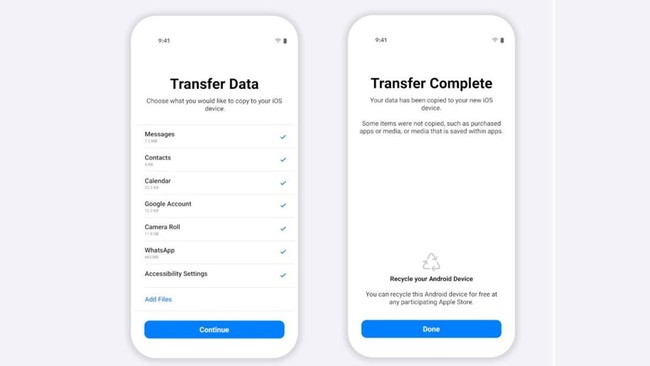 - Tap Continue untuk mentransfer data dari HP Android ke iPhone dan tunggu aplikasi Move to iOS mengonfirmasi transfer selesai.