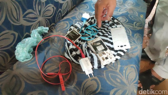 Hal itu terlihat dari ponsel yang ditemukan baterainya sudah dalam keadaan pecah dan berantakan. Baterai juga terlihat agak cembung, sedangkan kabel charger masih utuh.